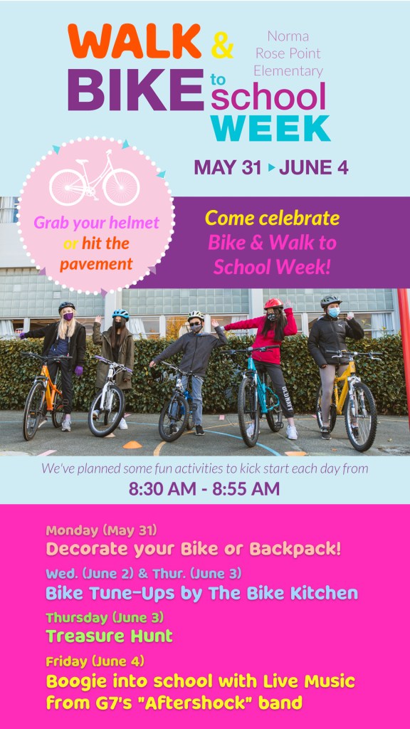 Norma Rose Point Elementary School and PAC are celebrating Bike & Walk to School Week this year from May 31 to June 4! We’re encouraging students and families to use active transportation for their trips to school all week – walking, biking, scootering, skateboarding, and mobility aids. This all helps to reduce congestion in our school neighbourhood, build community, promote health and wellness, and students arrive at school energized and ready to learn.