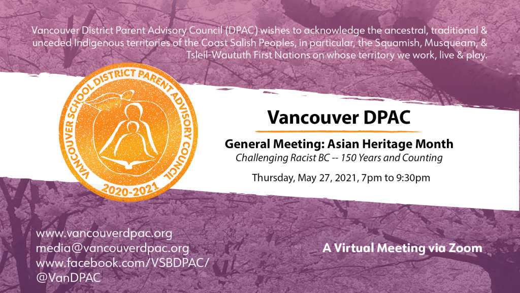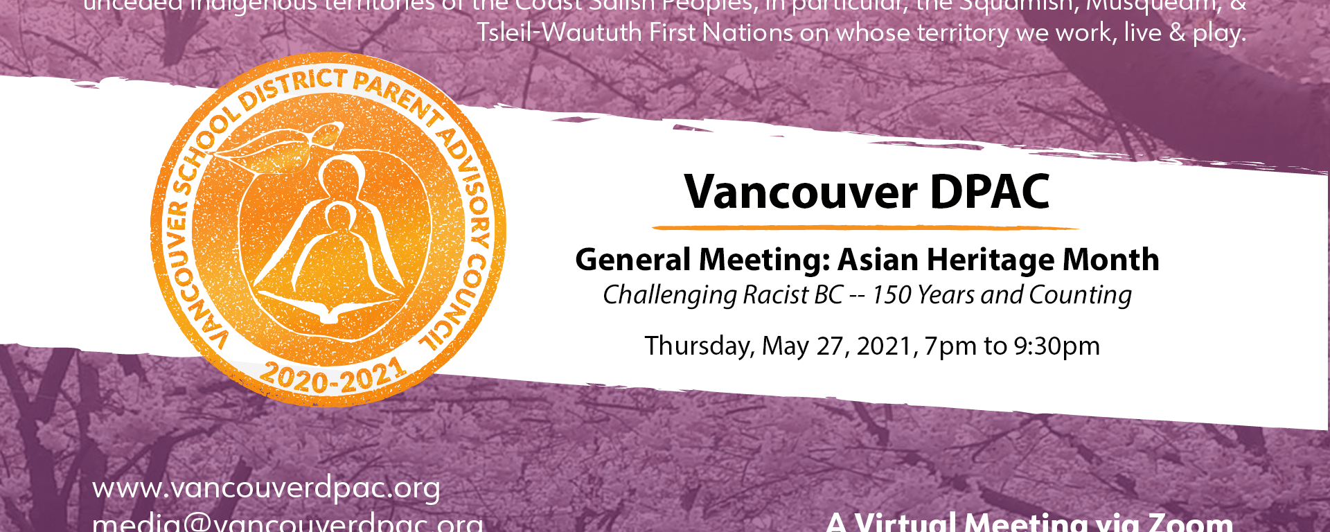 At the May General on Thursday, May 27, 7pm – 9:30 pm, following a short formal meeting, DPAC will mark Asian Heritage Month by welcoming Elimin8Hate as they facilitate an exploration of Challenging Racist BC — 150 Years and Counting, a project that seeks to explore our shared history and common future.