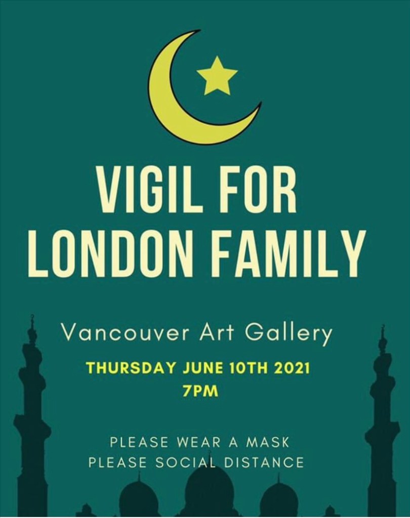 In Vancouver, while one vigil has already taken place, another is planned for later this week. The vigil will be held Thursday, June 10 at 7 p.m. on the Georgia Street side of the Vancouver Art Gallery in solidarity with the Muslim community.