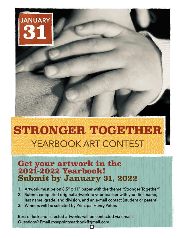 Everyone has been particularly resilient for the past couple years navigating the pandemic, and if it were not for the support of friends, family, teachers, staff, and the community, it would have been an even tougher two years. We would like to invite all students to think about what image they would create to show how we have been stronger together as a community. Any 2-dimensional medium(s) may be used including, but not excluding the following: paintings, drawings, computer art, and collage. Submit completed artworks on 8.5″ x 11″ paper to your teacher with your first name, last name, division, and an email address (parent or student) on the back to rosepointyearbook@gmail.com by January 31, 2022.