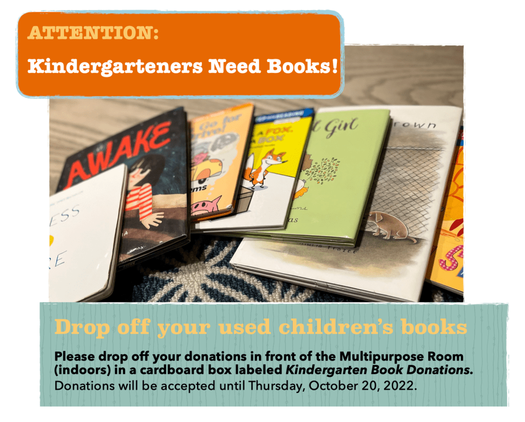 Kindergarten teachers have reached out to PAC to help start a book drive. They will be accepting any used books appropriate for kindergarten age students for the next couple weeks. Please drop off your used and loved books in a large box labeled “Kindergarten Book Drive” in front of the Multipurpose Room (indoors), across from the Main Office. The kindergarteners will be very grateful for your donation!