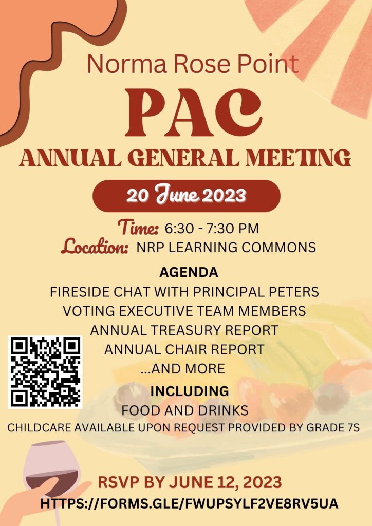 Join us for the Norma Rose Point Elementary’s last PAC meeting of the year. This meeting will take place in person! Food and refreshments will be provided, and childcare will be provided upon request. Please fill out the form below.
