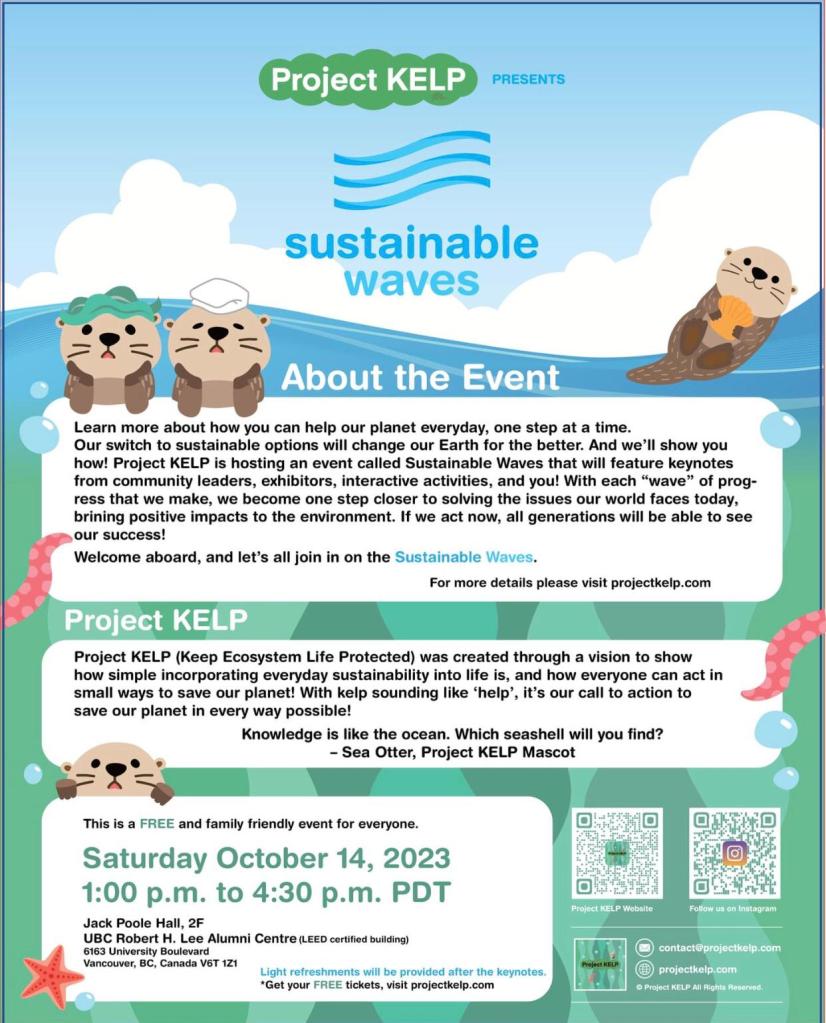 We would like to inform you of a community event organized by Project KELP (Keep Ecosystem Life Protected) for an event that will be held at UBC on Saturday, October 14.