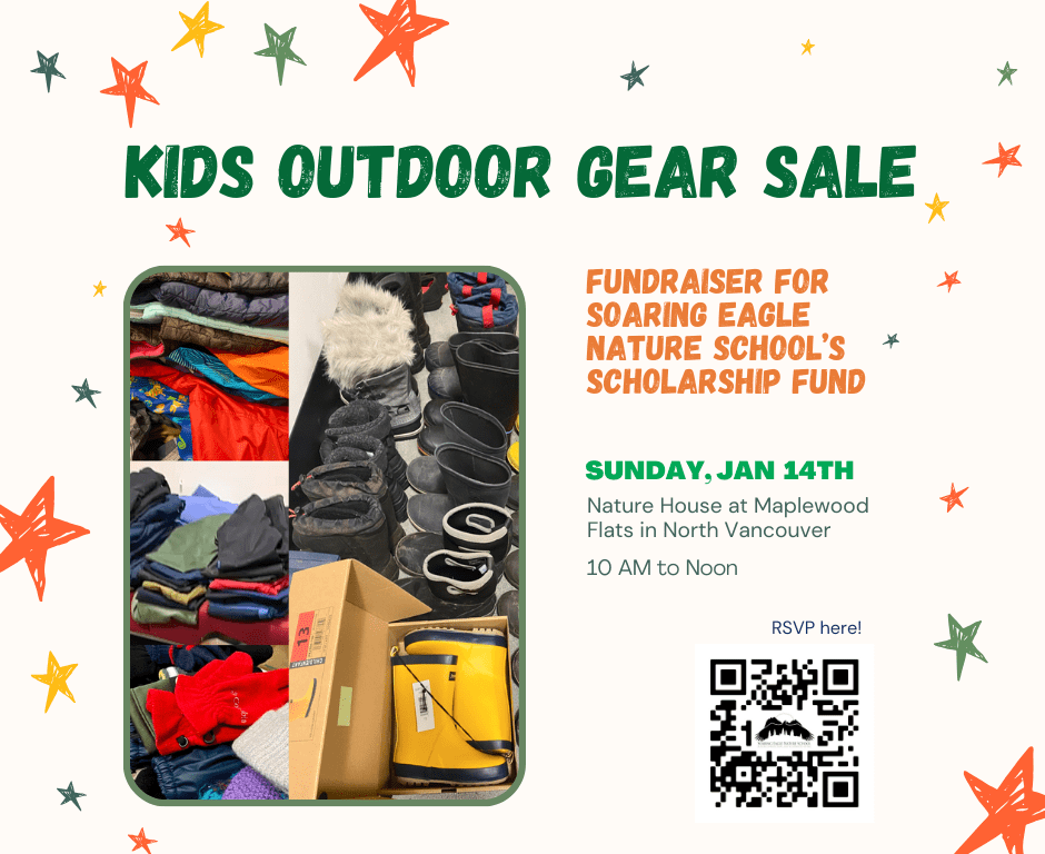 Come find quality items for your family’s outdoor adventures, including kid hiking boots and rain boots, raingear, base-layers, mid-layers, outerwear, gloves, warm hats, and wool socks, from $5 to $40. Get quality new and used gear, while simultaneously raising funds for the Soaring Eagle Nature School Scholarship Fund.