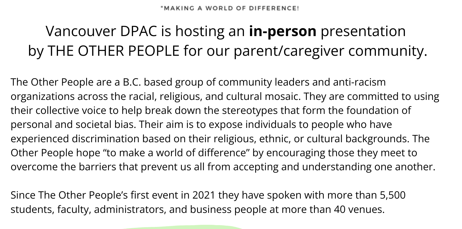 What: An in-person presentation from “The Other People” for the VSB Community. A free event with childcare provided for school-aged children.