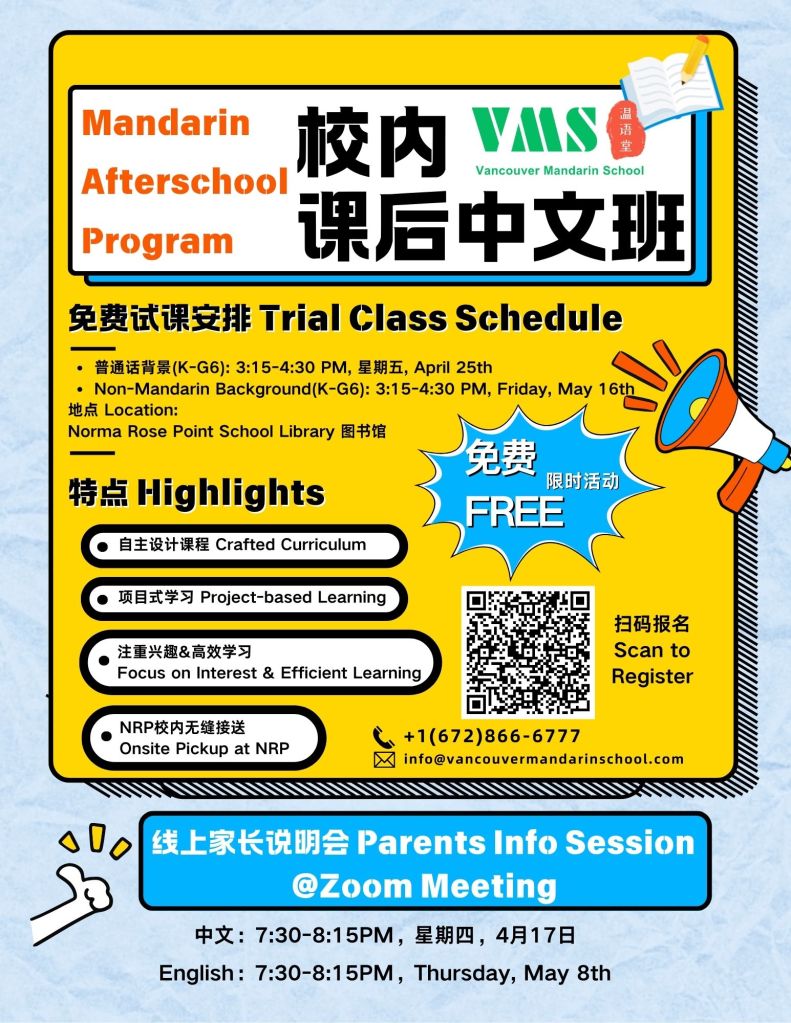 Our after-school Mandarin program has been running successfully for two years at Jamieson Elementary, where it has received very positive feedback. You can find more details about our curriculum and student learning outcomes on our website: https://www.vancouvermandarinschool.com/mingle-program